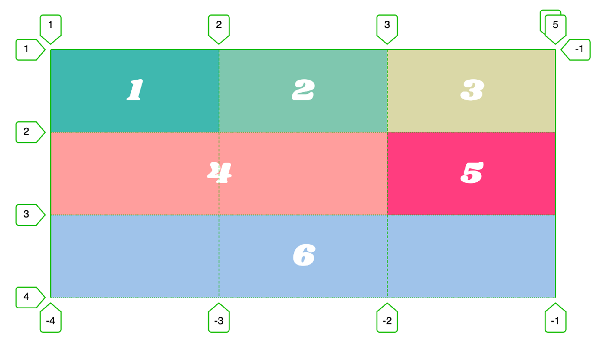 여기서의 숫자는 정확히는 그리드 라인(Grid Line)을 가리킨다. 위 그림을 보면 item1이 그리드 라인 1에서 시작해 4에서