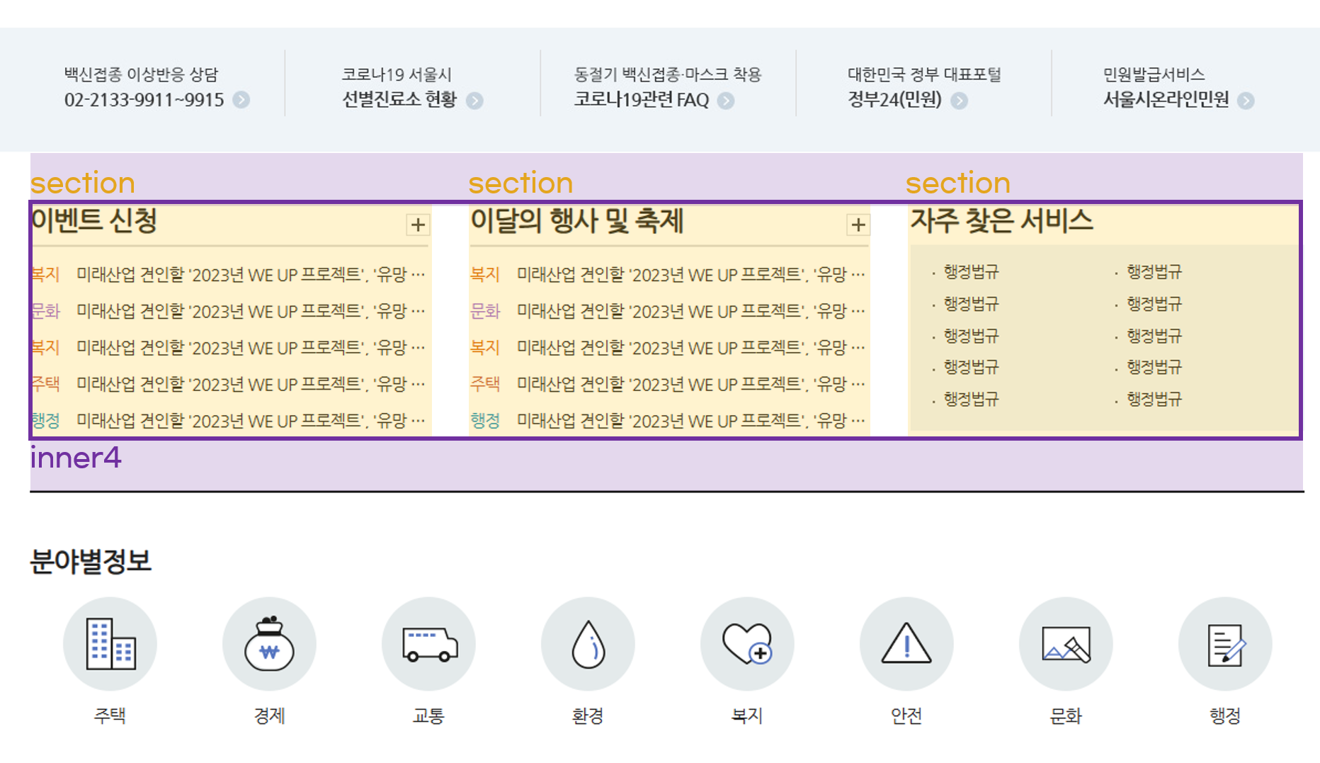 ๊ทธ๋ฆฌ๊ณ section๋ง๋ค ๋ค๋ฅธ inner๊ฐ์ ์ฌ์ฉํ๊ธฐ ๋๋ฌธ์ ์น์ ๋ค์ ๋ฌถ์์ inner1 ,inner2…๋ฑ์ผ๋ก ํด๋์ค ๋ช ์ ์ฃผ์๋ค.