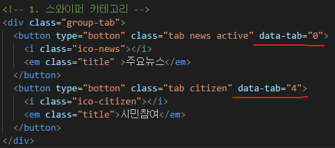 ๋๋ html์ data-tab์ผ๋ก ์์๋ฅผ ๋ฏธ๋ฆฌ ์์ฑํด ๋๊ณ data ๊ฐ์ ์ซ์ ๊ฐ ์์ผ๋ก ๋ถ๋ฌ์ค๋ ๋ฐฉ๋ฒ์ ์ฌ์ฉํ๋ค.